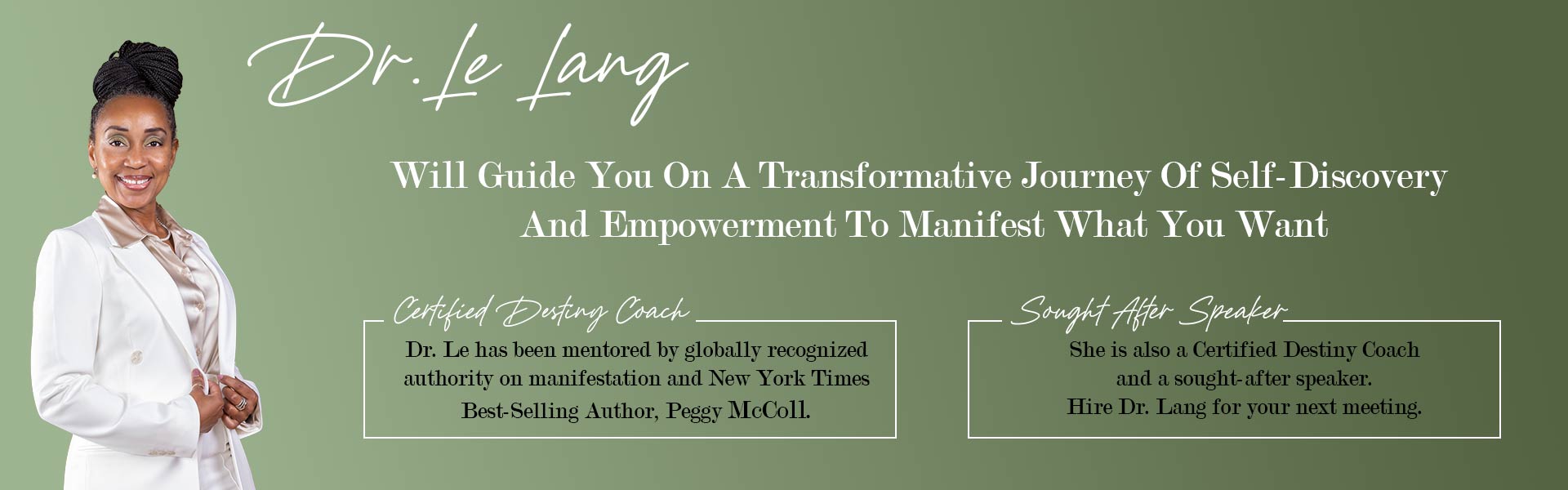 Dr. Le is an Empowerment Manifestation Consultant, Certified Destiny Coach, Speaker and Author.
